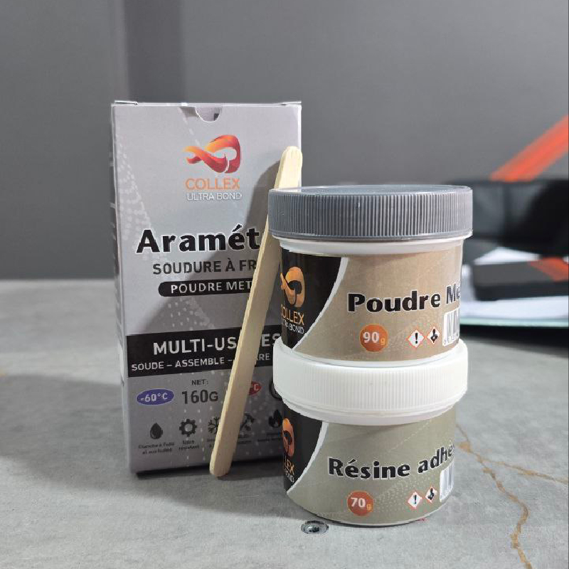 • Contient deux boîtes : un sachet de poudre métal 90g et une résine adhésive 70g, à mélanger pour obtenir une colle performante.