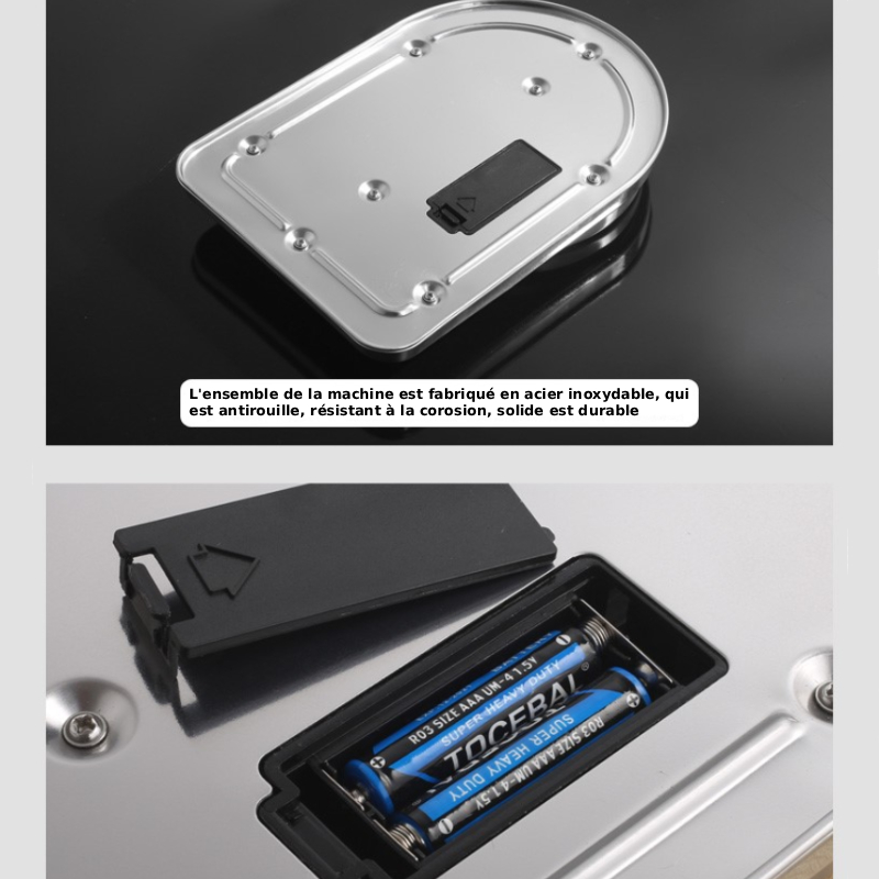 • Plateforme en acier inoxydable : Résistante, hygiénique et facile à nettoyer, idéale pour peser divers ingrédients