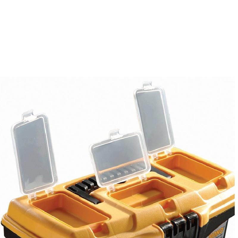 Dotée de petits rangements sur le couvercle, cette boîte permet de garder vis, boulons, écrous, rondelles et autres petits accessoires bien organisés et facilement accessibles. Sa taille moyenne la rend pratique à transporter tout en offrant une capacité optimale pour un usage professionnel ou domestique.