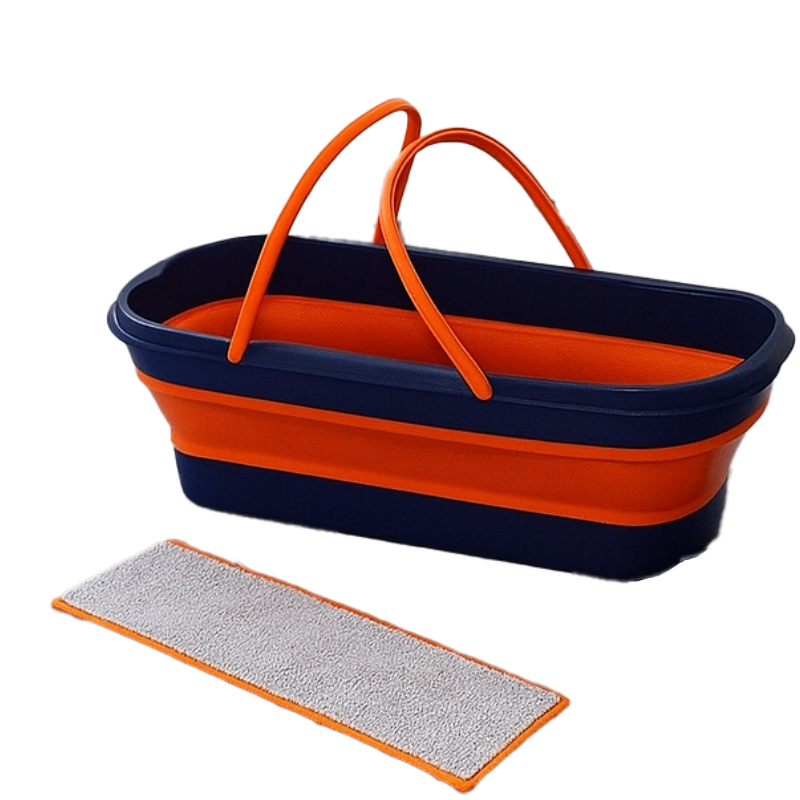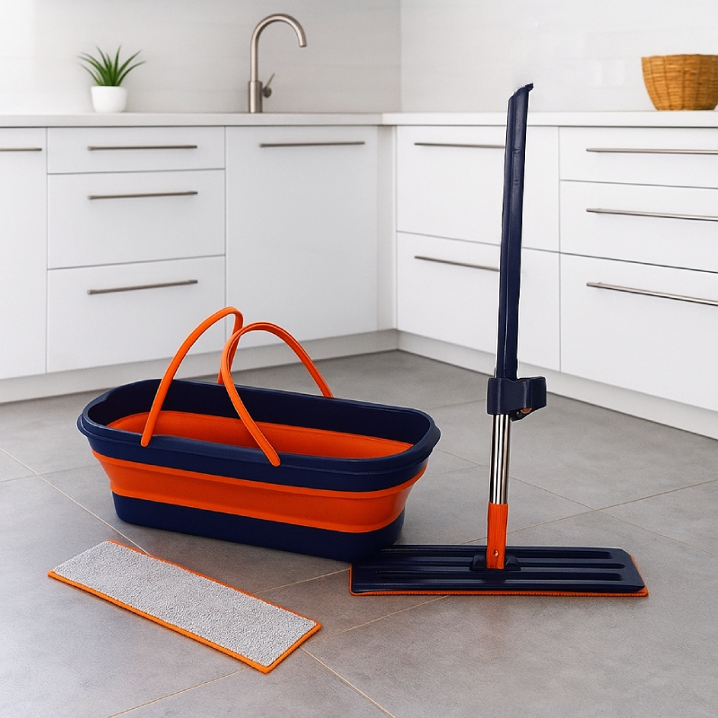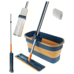 Cet ensemble comprend un balai 2 en 1, auto-essorant, et un seau pliable avec roulettes, conçu pour rendre le nettoyage plus facile, plus hygiénique et moins fatigant.