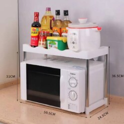 Grâce à ses dimensions généreuses (71 × 50 × 24,5 cm, avec 31 cm par section), elle s’adapte à la majorité des micro-ondes et cuisines. Moderne, fonctionnelle et résistante, cette étagère est la solution parfaite pour une cuisine bien organisée et optimisée.