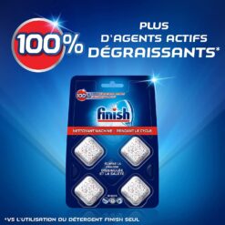 Une machine plus propre c’est une vaisselle plus propre. Or, votre lave-vaisselle est plus sale qu’il n’y paraît. Jour après jour, la graisse et le calcaire s’accumulent jusque dans ses parties cachées et vitales et peuvent nuire à ses performances. Finish Nettoyant Machine Pendant le Cycle nettoie votre machine pendant qu’elle lave votre vaisselle ! Finish Nettoyant Machine Pendant le Cycle facilite votre quotidien! Plus besoin d’attendre que la machine soit vide: ajoutez Finish Nettoyant Machine pendant le Cycle dans votre machine avant de lancer votre programme de lavage habituel, il se charge de nettoyer votre lave-vaisselle. Fonctionne même en cycle court et à basse température. Pour un entretien optimal il est conseillé d’utiliser Finish Nettoyant Machine Pendant le Cycle une fois par mois, placé à n’importe quel endroit du lave-vaisselle. En complément : Nettoyant Machine Intégral, à utiliser tous les mois pour un nettoyage en profondeur de votre lave-vaisselle. A utiliser en complément de votre détergent.