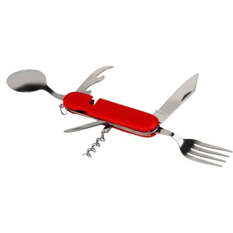 - Couverts de camping 6 en 1: couteau, fourchette, cuillère, tire-bouchon, tournebroche et ouvre-boîtes en une seule unité