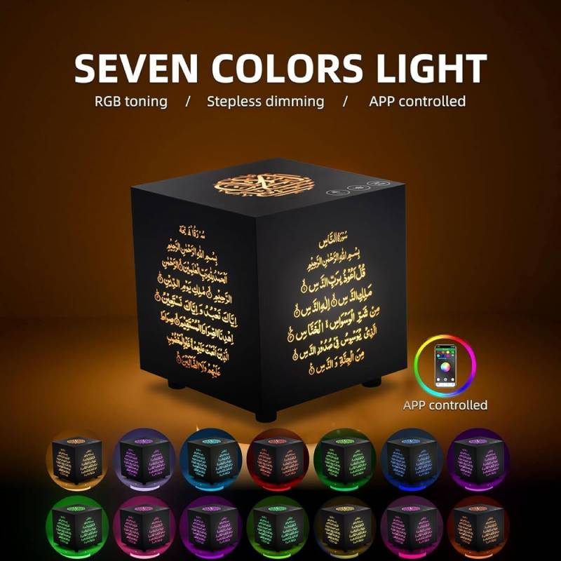 Son éclairage RGB multicolore avec réglage de luminosité crée une atmosphère apaisante, idéale pour la récitation nocturne ou la méditation. Le contrôle est simple et intuitif grâce aux boutons tactiles, à la télécommande (avec raccourcis rapides) ou à l’application mobile dédiée.