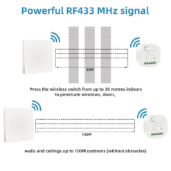 La transmission sans fil est stable et sensible, avec une portée allant jusqu’à 100 mètres en extérieur (sans obstacle) et 30 mètres en intérieur, assurant un fonctionnement fluide dans toute la maison. Le système utilise un récepteur RF 433 MHz, reconnu pour sa fiabilité.