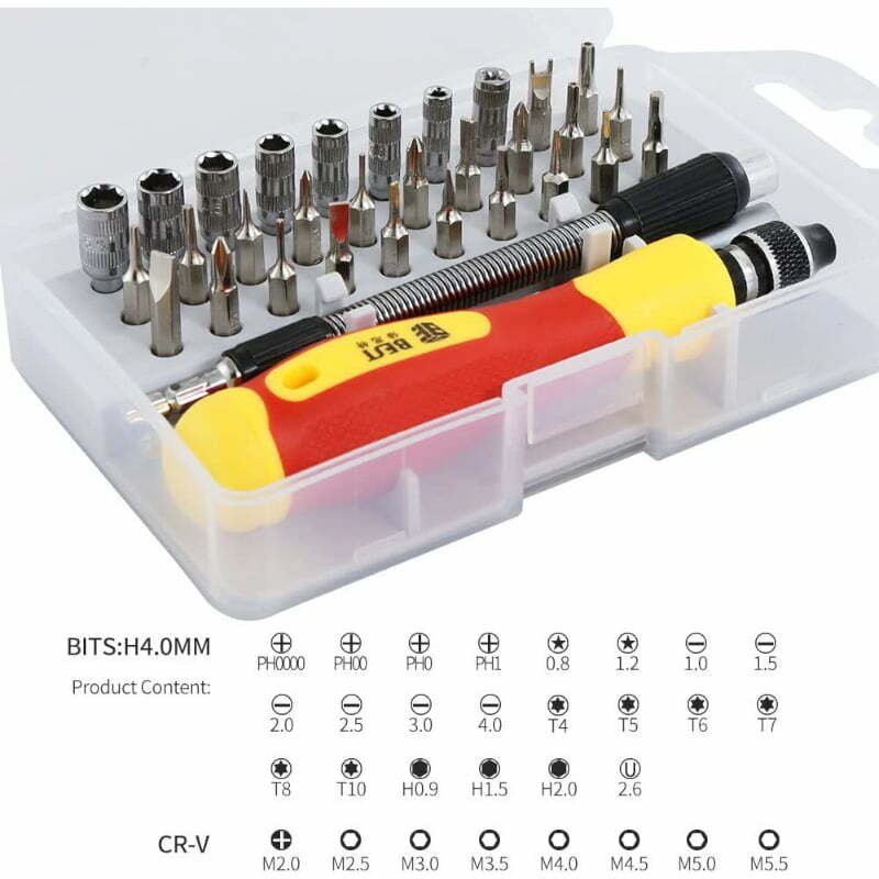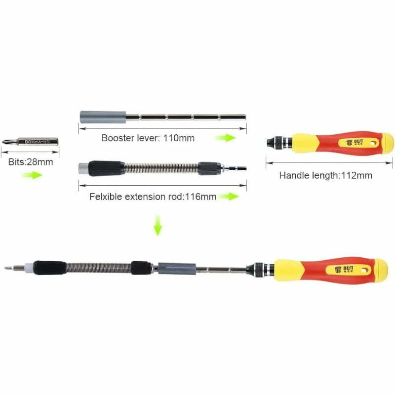 - Contenu : 1 x Corps principal avec fixation magnétique, 1 x rallonge flexible, 1 x rallonge rigide, 30 embouts