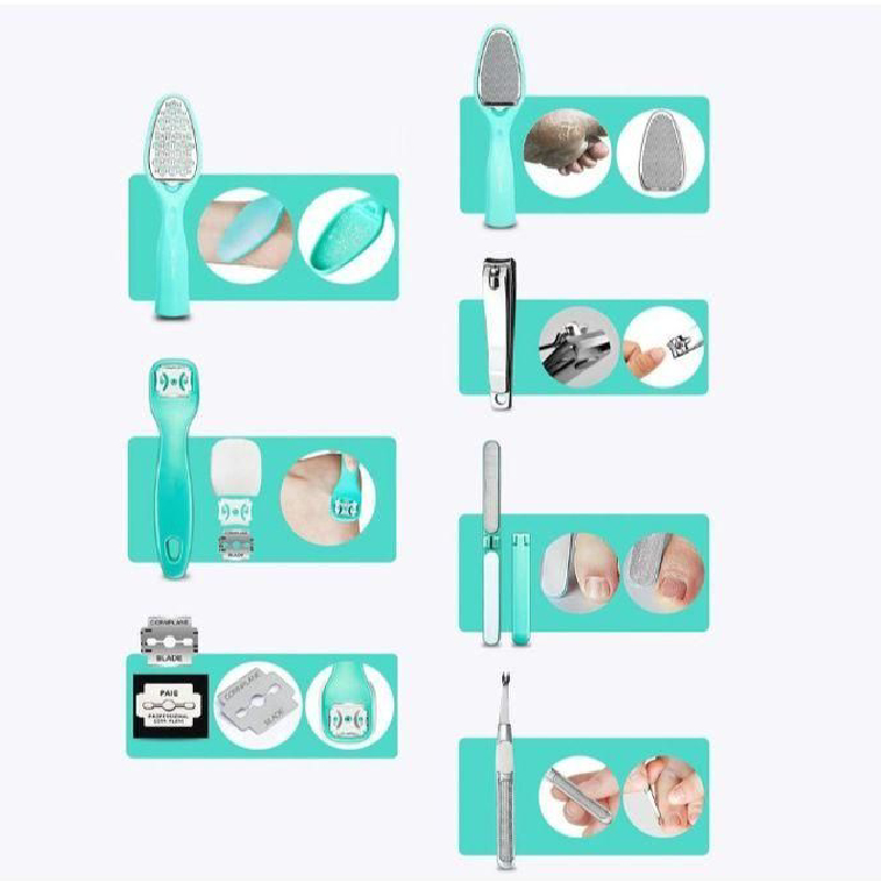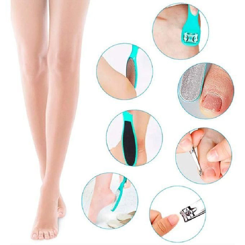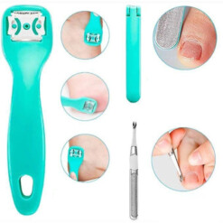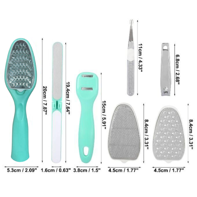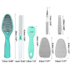 - Multifonctions : cet ensemble comprend une lime grossière, un grattoir, une lime fine, une lame pour callosités, une lime à ongles, un coupe-ongles et d’autres outils essentiels pour un soin complet des pieds.