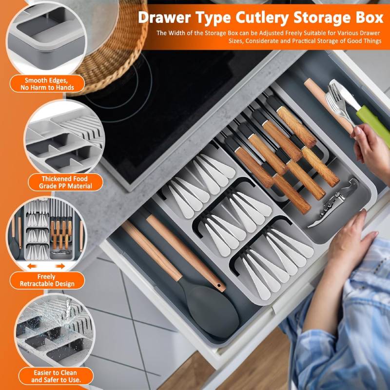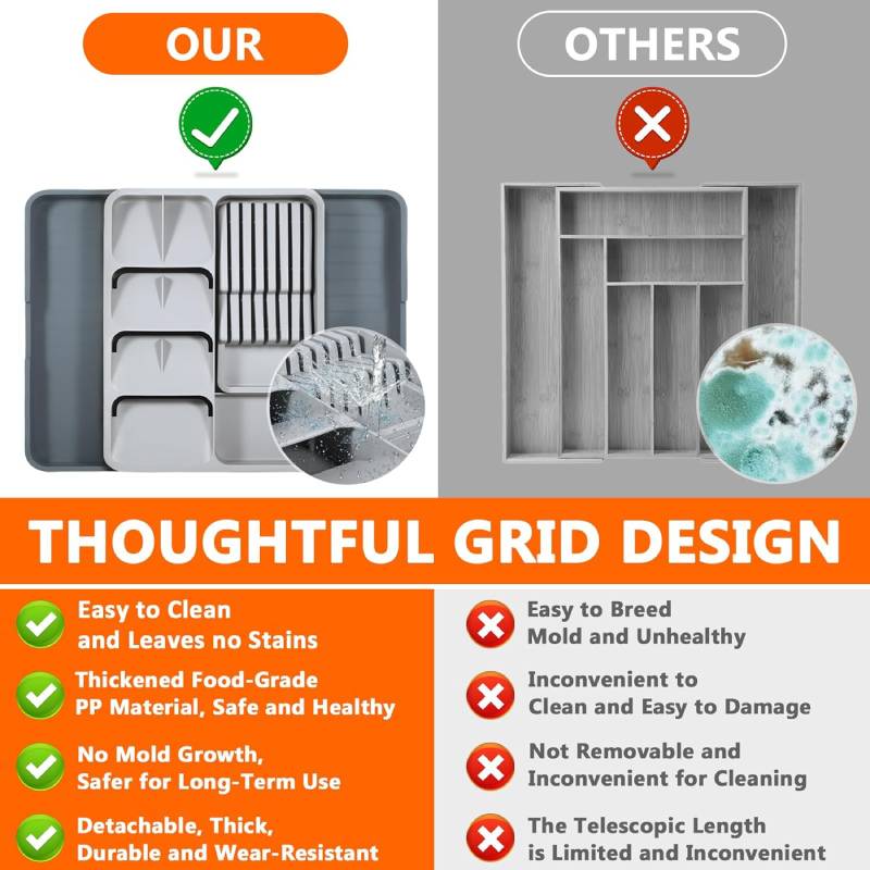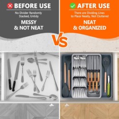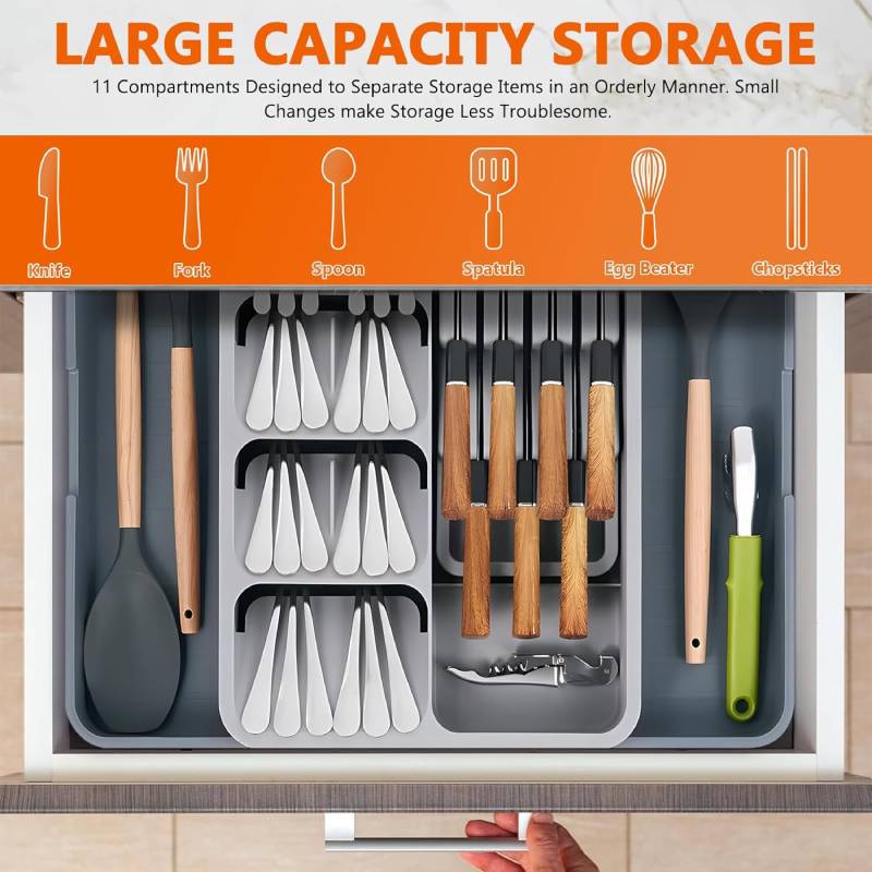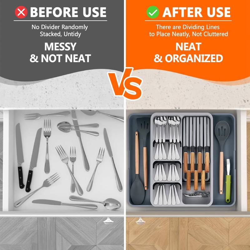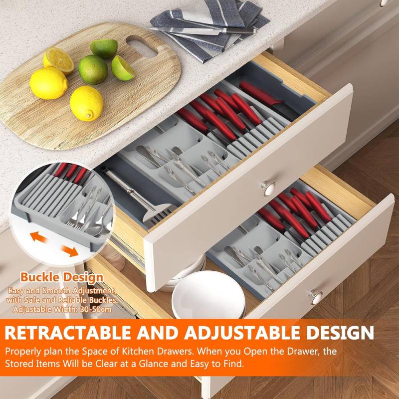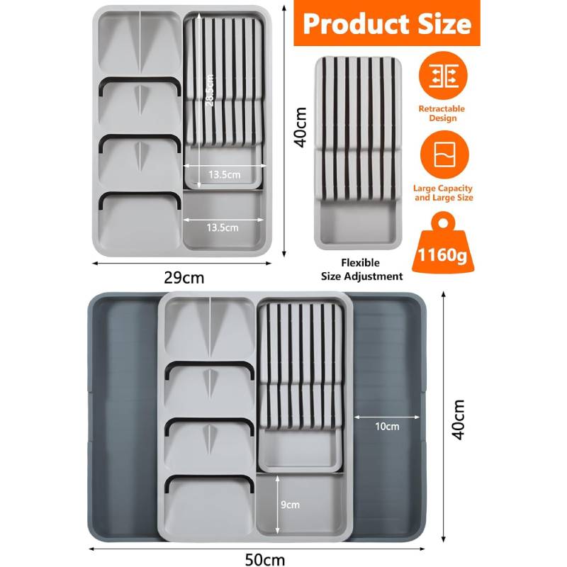 Grâce à son design extensible (de 40×28 cm à 40×45 cm), il s’adapte facilement à différents types de tiroirs, offrant une flexibilité maximale. Ses 8 compartiments spacieux permettent de ranger efficacement couverts, spatules, ustensiles et bien plus encore.