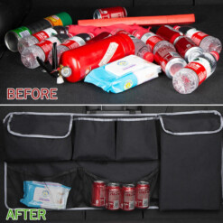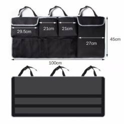 Avec une taille de 100 x 45 cm, il offre une capacité exceptionnelle pour ranger tous vos accessoires. Il dispose de 6 poches, dont 2 en mesh, parfaites pour organiser vos jouets, outils, boissons, snacks, produits de nettoyage, livres, magazines ou courses. Fini le désordre dans votre voiture : tout reste à portée de main, tout en étant bien rangé.