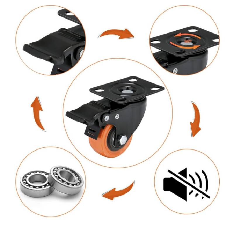 Les roues sont fabriquées en polyuréthane (PU) de haute qualité, un matériau reconnu pour son absorption des chocs, sa réduction des vibrations et du bruit, et sa protection des sols. Le frein combiné intégré permet de bloquer simultanément la roue et la rotation, assurant une stabilité parfaite et une sécurité maximale lors de l’utilisation.