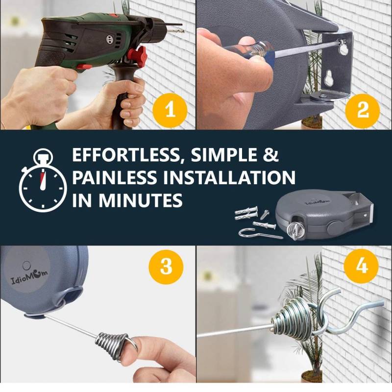 Grâce à son design rétractable, la corde peut être enroulée après utilisation, ce qui permet un gain de place optimal. Elle s’installe facilement grâce au support mural et au crochet à œillet inclus, et convient parfaitement à une buanderie, un balcon, une terrasse, un jardin, un patio, une cave ou un porche.